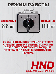 Ключевая особенность HND GE11000JQSTD ATS – это электростанция с переключателем, позволяющим выдавать мощность практически без потери мощности как на три фазы (400В), так и на одну (230В). Благодаря использованию обмотки с увеличенным сечением генератор обладает максимальной мощностью 11 кВт в трехфазном и 8,8 кВт в однофазном режиме. Этот генератор станет полноценным источником питания для приборов, рассчитанных на напряжение как 230 В, так и 400 В.