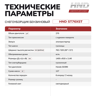 При выборе снегоуборщика особую роль играет двигатель. Гусеничные снегоуборщики HND оснащаются 4-тактными двигателями Honda GX390 и GX270. Двигатели Honda известны своей надежностью и долговечностью. Это позволит вам долгое время не беспокоиться о поломках и техническом обслуживании. Инженеры Honda разработали свои двигатели с учетом работы в условиях низких температур, что делает их особенно подходящими для российской зимы. Кроме того, двигатели Honda обеспечивают высокий крутящий момент. Это потенциально позволяет снегоуборщику быть более эффективным при уборке глубокого снега или тяжелых заносов. Высокая производительность также значит, что вам не придется тратить много времени на уборку.